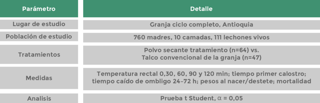Ensayos controlados han demostrado que el secado inmediato con desecantes reduce la pérdida de calor por evaporación y atenúa el descenso de la temperatura rectal en los primeros 60 minutos, especialmente en lechones livianos (Blackie, 2019; Vande, 2021).