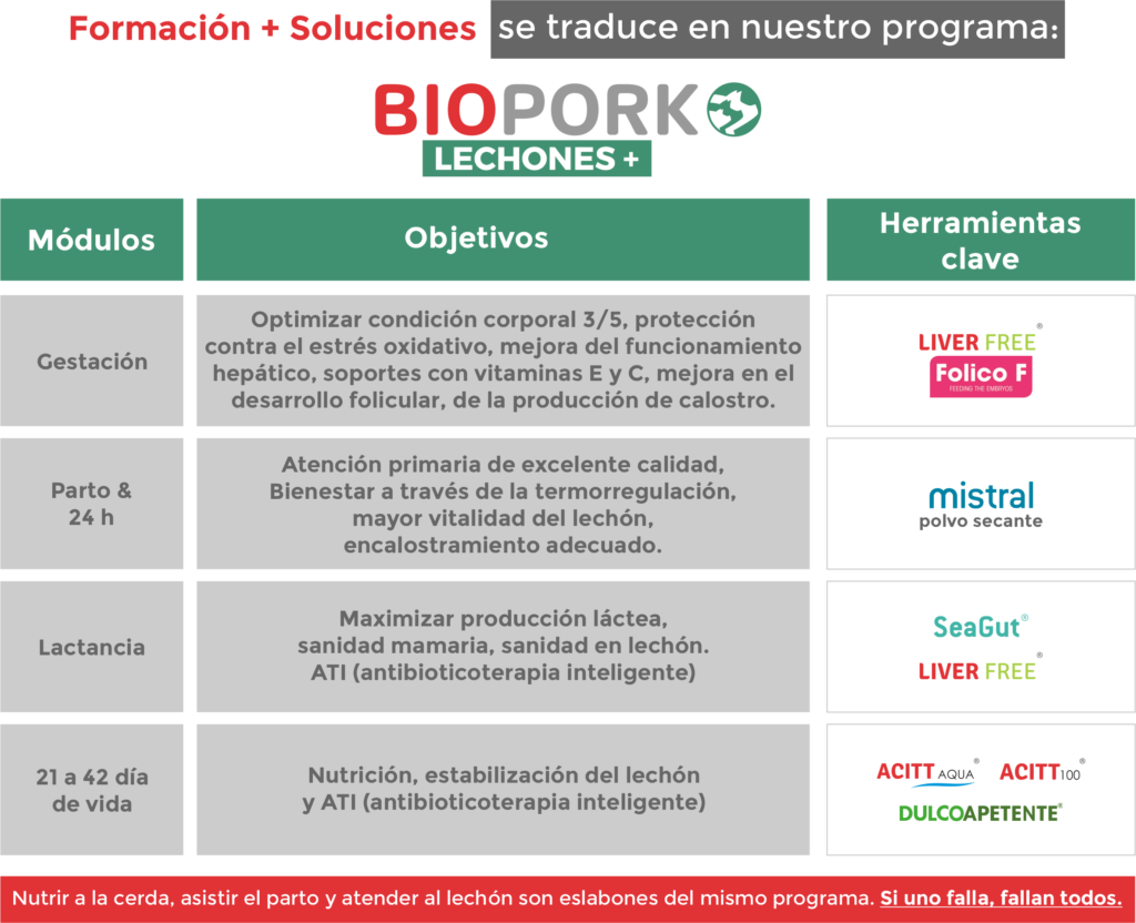 BIOPORK LECHONES+ es un programa integral de formación diseñado por BIOTECNO como una herramienta de apoyo técnico que provea soluciones para elevar la vitalidad y la supervivencia del lechón, estandarizar prácticas críticas en sala de partos y lactancia y cerrar brechas de desempeño desde la gestación hasta los 42 días. Integra protocolos de manejo, herramientas de diagnóstico en granja, uso de aditivos tecnológicos, sensoriales y zootécnicos con recomendaciones basadas en evidencia de campo y literatura científica para impactar en el desempeño de la hembra y el lechón, en factores críticos como: estrés oxidativo, estrés térmico y vigor al nacer, encalostramiento efectivo, crecimiento temprano y menor variabilidad de pesos en las camadas.