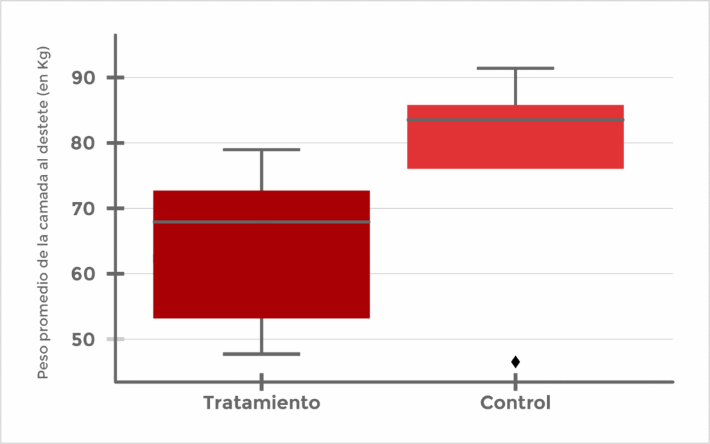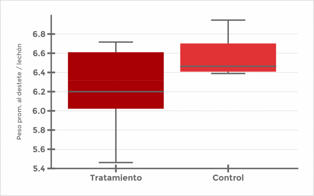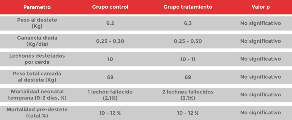 En nuestro ensayo, no se observaron diferencias significativas en el número de lechones destetados ni en el peso promedio al destete. Por lo tanto, el beneficio de este aditivo es más sutil y se relaciona primariamente con el bienestar animal y la mejora de las condiciones fisiológicas iniciales.