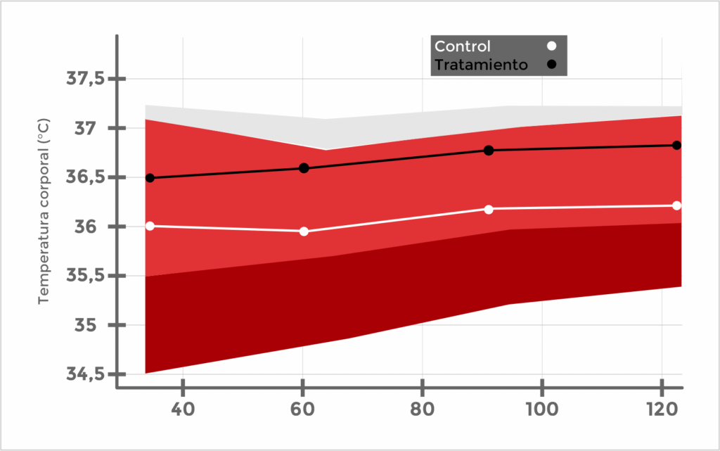 La recuperación de la temperatura corporal postnatal fue notablemente superior en los lechones que recibieron el aditivo secante, una diferencia que se hizo estadísticamente significativa a partir de los 30 minutos de vida y se mantuvo consistente a lo largo de las primeras dos horas postparto. Mientras que los lechones tratados exhibieron una recuperación térmica más rápida y sostenida, aproximándose a su temperatura de nacimiento, los controles permanecieron significativamente más fríos. Esta evolución y las diferencias entre grupos se detallan en la Tabla 5 y se ilustran visualmente en la grafico 4. La menor dispersión térmica observada en el grupo tratado, reflejada en intervalos de confianza más estrechos (grafico 4), sugiere una respuesta termorreguladora más uniforme entre los individuos.