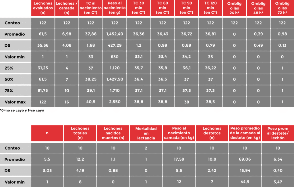 La mortalidad y supervivencia se documentaron, registrando el número de lechones fallecidos en las primeras 48 horas postparto (catalogada como mortalidad neonatal temprana) y durante toda la fase de lactancia hasta el destete. Siempre que fue posible, se anotaron las causas aparentes de muerte, tales como aplastamiento, debilidad o diarrea, entre otras.