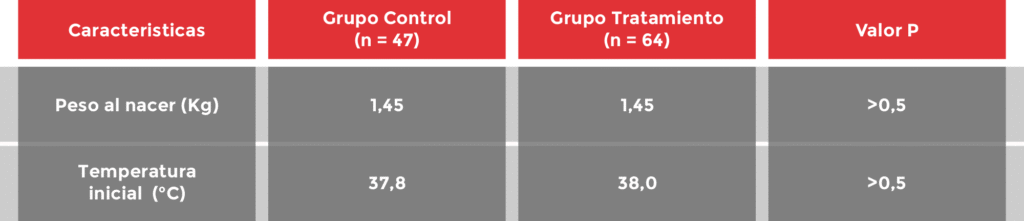Al inicio del estudio, los lechones mostraron características similares. El peso promedio al nacer fue idéntico entre el grupo de tratamiento y el control, sin diferencias estadísticamente significativas.
