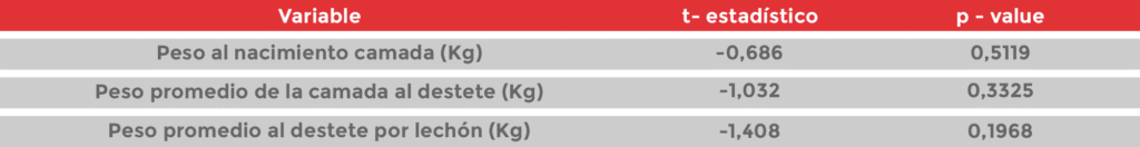 *t* de Student para comparar grupos (*p* < 0.05), sin ajustes adicionales por camada. El estudio comparó directamente ambos métodos bajo condiciones prácticas de granja, priorizando indicadores de vitalidad neonatal y desempeño productivo.