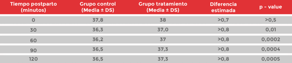 Tabla 5: Comparación de la temperatura entre el grupo control y el grupo tratamiento en diferentes tiempos postparto.